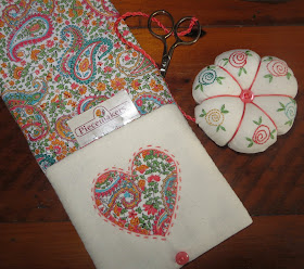 This appliqued pencil case will be very useful. Enjoy trying your hand at needleturn or applique the pictures with fusible web if you wish. I have made my first sample with some Japanese fabrics I have been collecting but any favourite scraps of fabric will work. I am working on a second one in some Anni Downs' fabric to show you a different take on the same project. I have pieced the back using 3/4" hexagons. Bring along your glue pen and fine thread if you wish to try some English paper piecing. The threads used are DMC 3031, 610, 613, 3011 and 3857.